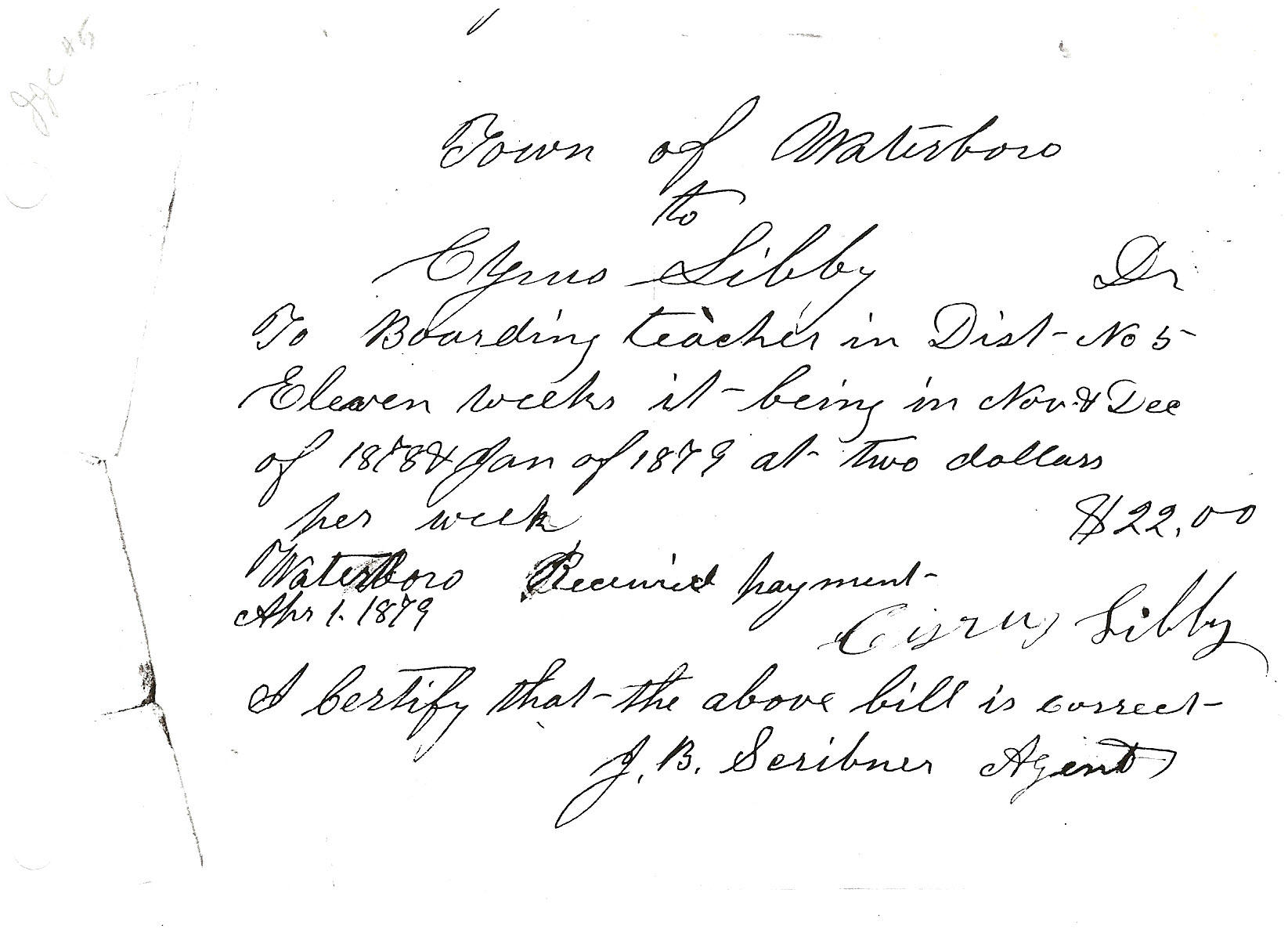 Copy of agent receipts for School District #5. At that time J. B. Scribner (Jeremiah Bullock Scribner) was the agent and his signature appears thereon.